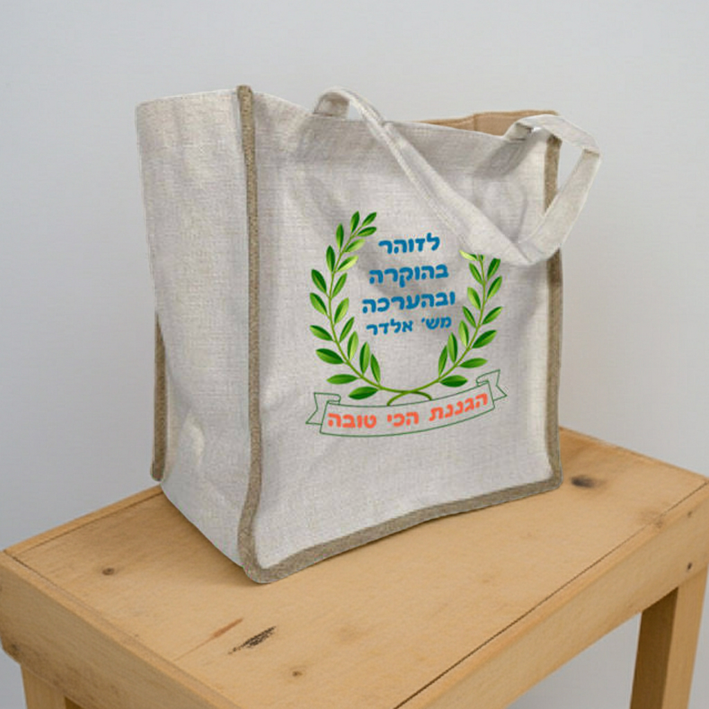 תיק יוטה ממותג – תיק רב-פעמי, הניתן לכביסה ולשימושים חוזרים – מתנה עם הדפסה אישית למורה, לגננת ולצוות. התיק מתאים לנשיאת מוצרים שונים, קניות ועוד.