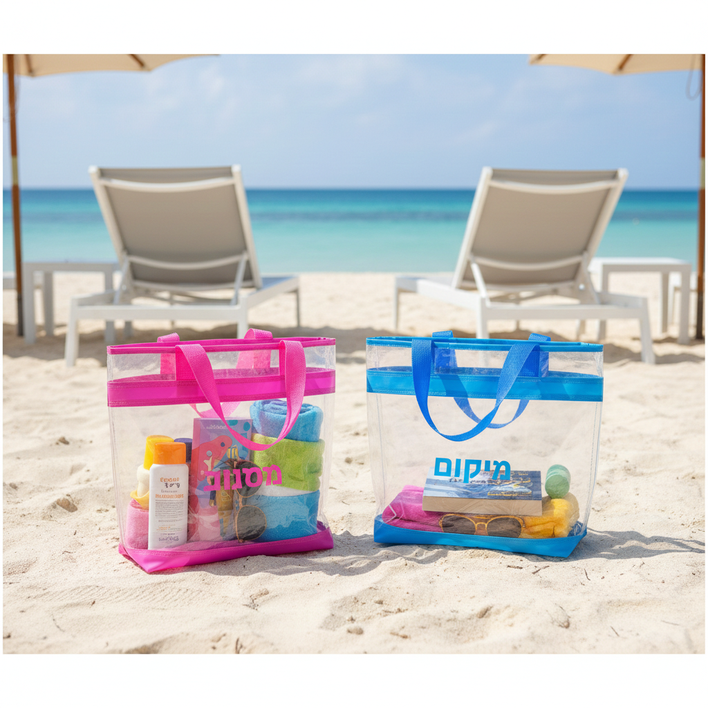 תיק ים שקוף עם שם – תיק שקוף עשוי מ-PVC בשילוב בד מתאים לים / לבריכה לקניות ולסידורים. תא מרכזי גדול עם סגירת רוכסן. גודל כ-41*34 ס"מ. מתנה שימושית לגננות, למורים ולצוות. תוסיפו גם מגבת חוף ו/או בקבוק ויש לכם מתנה מושלמת.