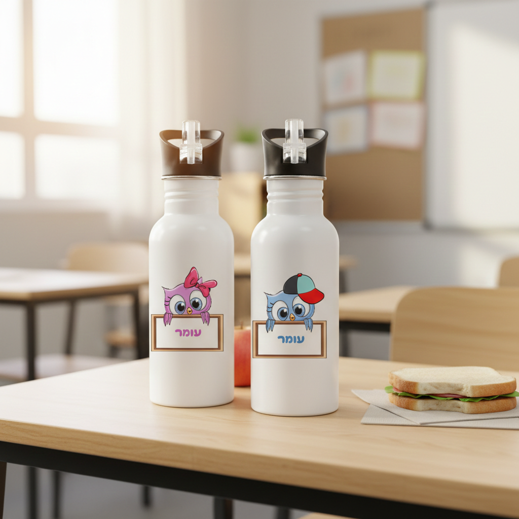 בקבוק אקולוגי עם שם הילד – מומחים ממליצים להחליף את בקבוק המים מפלסטיק לבקבוק אקולוגי רב-פעמי. הבקבוק עשוי נירוסטה עם קשית ופייה מתכווננת – מתנה שימושית ליום הולדת או לסוף שנה, עם הדפסה אישית של איור ובו משולב שם הילד/ה והקדשה מהגן. תוכלו גם לשלוח אלינו תמונה או עיצוב משלכם להדפסה על הבקבוק.