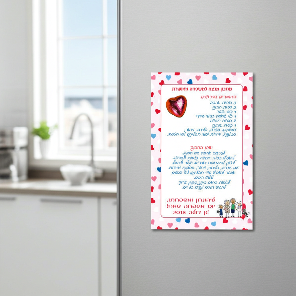 מגנט עם שוקולד – מתנה קטנה וסמלית ליום המשפחה בגן מגנט ממתכת בגודל גלויה עם "מתכון" למשפחה מאושרת אליו צמוד שוקולד לב קטן (או פרח מלאכותי לאלרגנים) שאומר בעצם הכל. אפשר להוסיף הקדשה ושם הגן ללא תוספת תשלום.