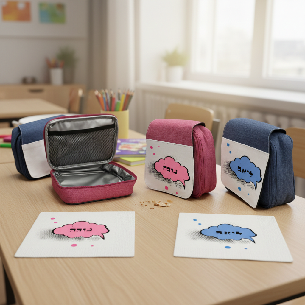 מפית ותיק אוכל עם שם במיתוג אישי – מתנה שימושית לבוגרי גן חובה העולים לכיתה א'. מארז הכולל תיק אוכל מבד ומפית-בד עם הדפסים דומים מאחד הדגמים שלנו, בו נשלב גם את שם הילד/ה והקדשה או שתוכלו לשלוח עיצוב משלכם.