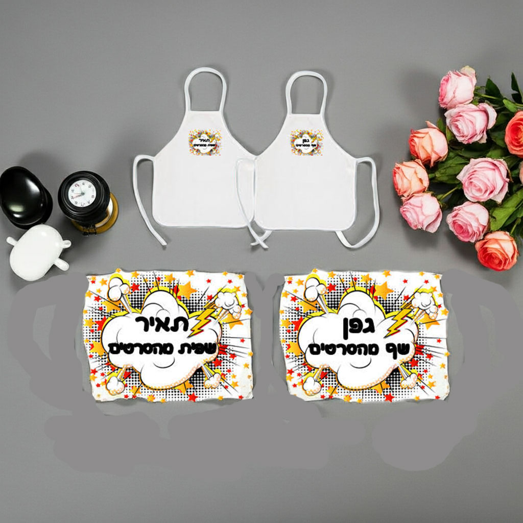 סינר לילדים לפסח – רוצים שהילדים יעזרו בהכנות לקראת הפסח? אפשר לעשות זאת בעזרת סינר עם תמונה או שם. מתנה שימושית לפסח ולשאר ימות השנה: סינר לילדים עם הדפסה צבעונית לפי בחירה מאחד הדגמים שלנו בו נשלב גם את הכיתוב / לוגו שלכם. תוכלו גם לשלוח עיצוב / לוגו משלכם. כל שעליכם לעשות, לאחר ביצוע ההזמנה, הוא לשלוח אלינו במייל את הכיתוב ו/או הלוגו / תמונה להדפסה על הסינרים וביג בן יעשה את השאר.