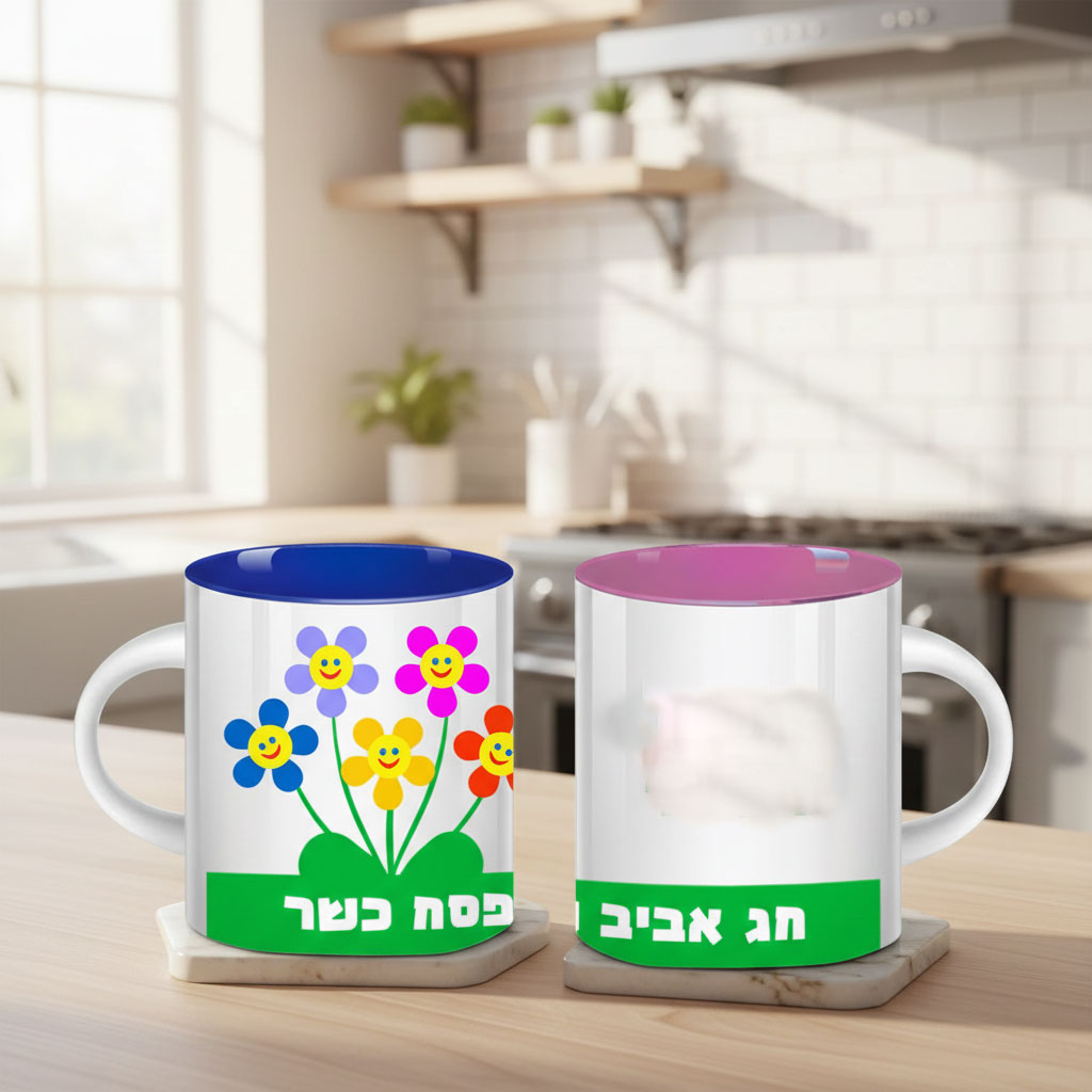 ספל צבעוני לפסח עם הדפסה צבעונית גם מבחוץ.  אפשר להדפיס את האחד העיצובים שלנו המיוחדים לפסח, בשילוב הלוגו / התמונה או השם והקדשה אישית או שתוכלו גם לשלוח עיצוב / לוגו משלכם. כל שעליכם לעשות, לאחר ביצוע ההזמנה, הוא לשלוח אלינו במייל את הכיתוב ו/או הלוגו / תמונה להדפסה על הספל וביג בן יעשה את השאר.