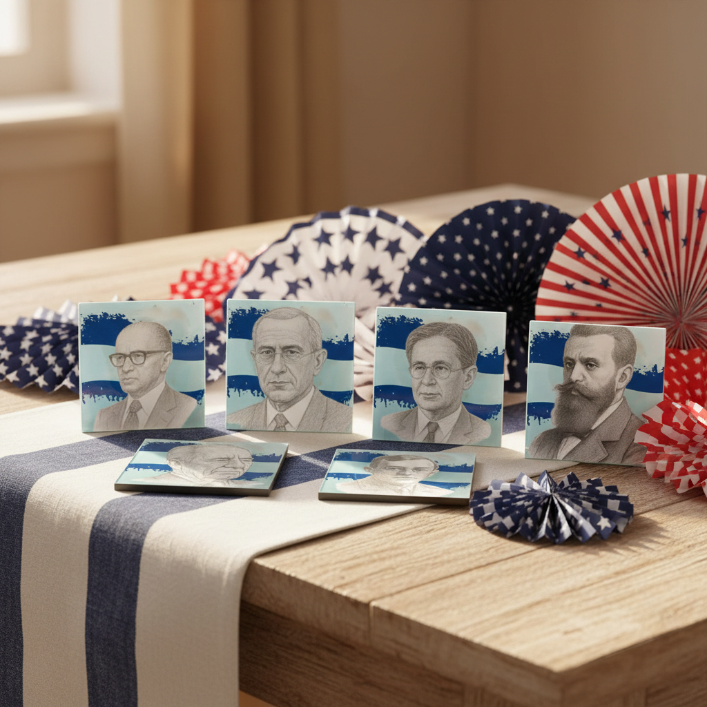 תחתיות מזכוכית לספלים וכוסות עם הדפסת ציורים של גדולי האומה בהתאמה אישית.