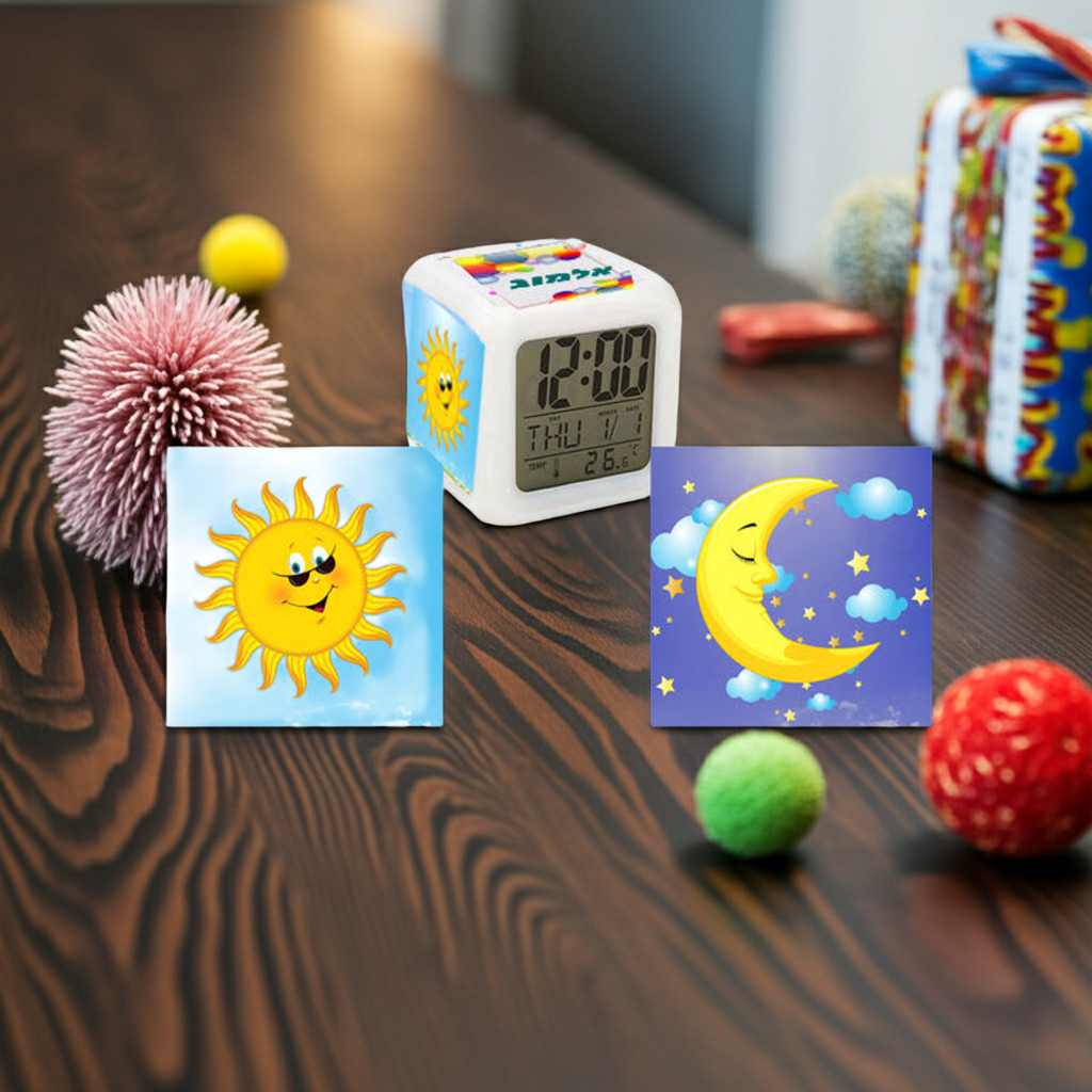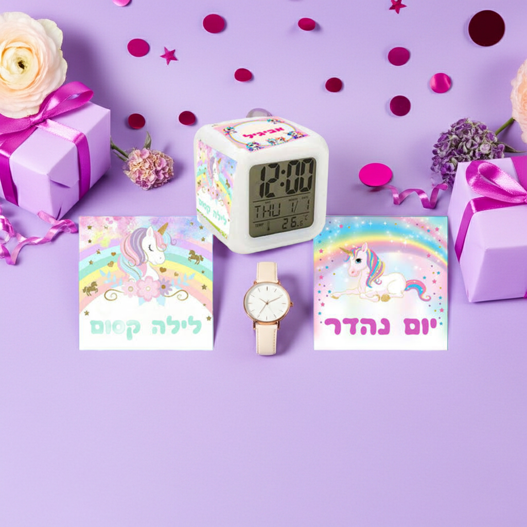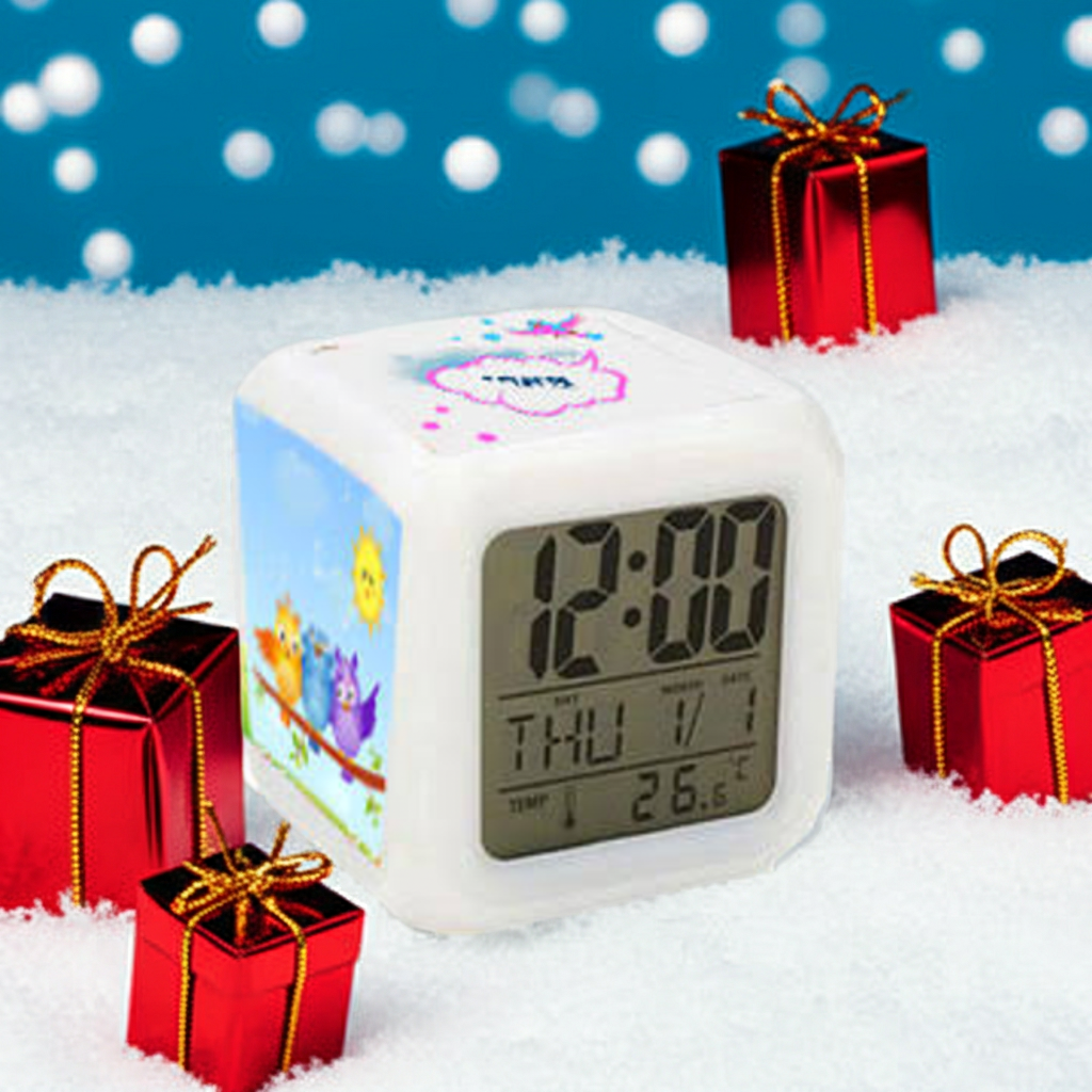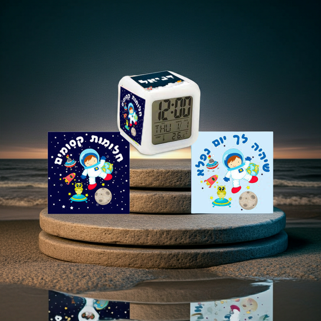 שעון עם תאורה מתחלפת – שעון מעורר מקסים לחדר ילדים עם תאורה מתחלפת בצבעים שונים. עם 3 הדפסה ב-3 פאות של השעון, כולל שם או תמונת הילד/ה – מתנה לילדים ליום הולדת / לסוף שנה / לחגים ומכל סיבה.