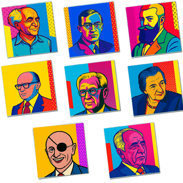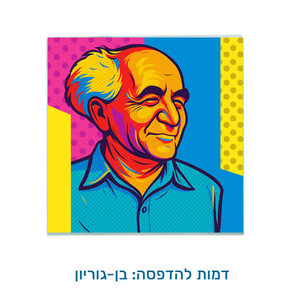 תחתית מזכוכית לכוסות עם הדפסה בסגנון פופ ארט של גדולי האומה, שהשפיעו רבות על מדינת ישראל – מתנה ליום העצמאות, לאנשים אהובים, לנסיעות לחו"ל, לתיירים בארץ, מורה / גננת / בוס, לחבר'ה בצבא או כמתנות פרסום וקידום מכירות. אפשר לשנות את תמונות האישים לפי העדפותיכם ולהוסיף לוגו ללא תוספת תשלום. תוכלו גם לשלוח את העיצוב האישי שלכם. כל שעליכם לעשות הוא לשלוח אלינו במייל את הכיתוב ו/או הלוגו / תמונה להדפסה על התחתיות מזכוכית לספלים וביג בן יעשה את השאר.