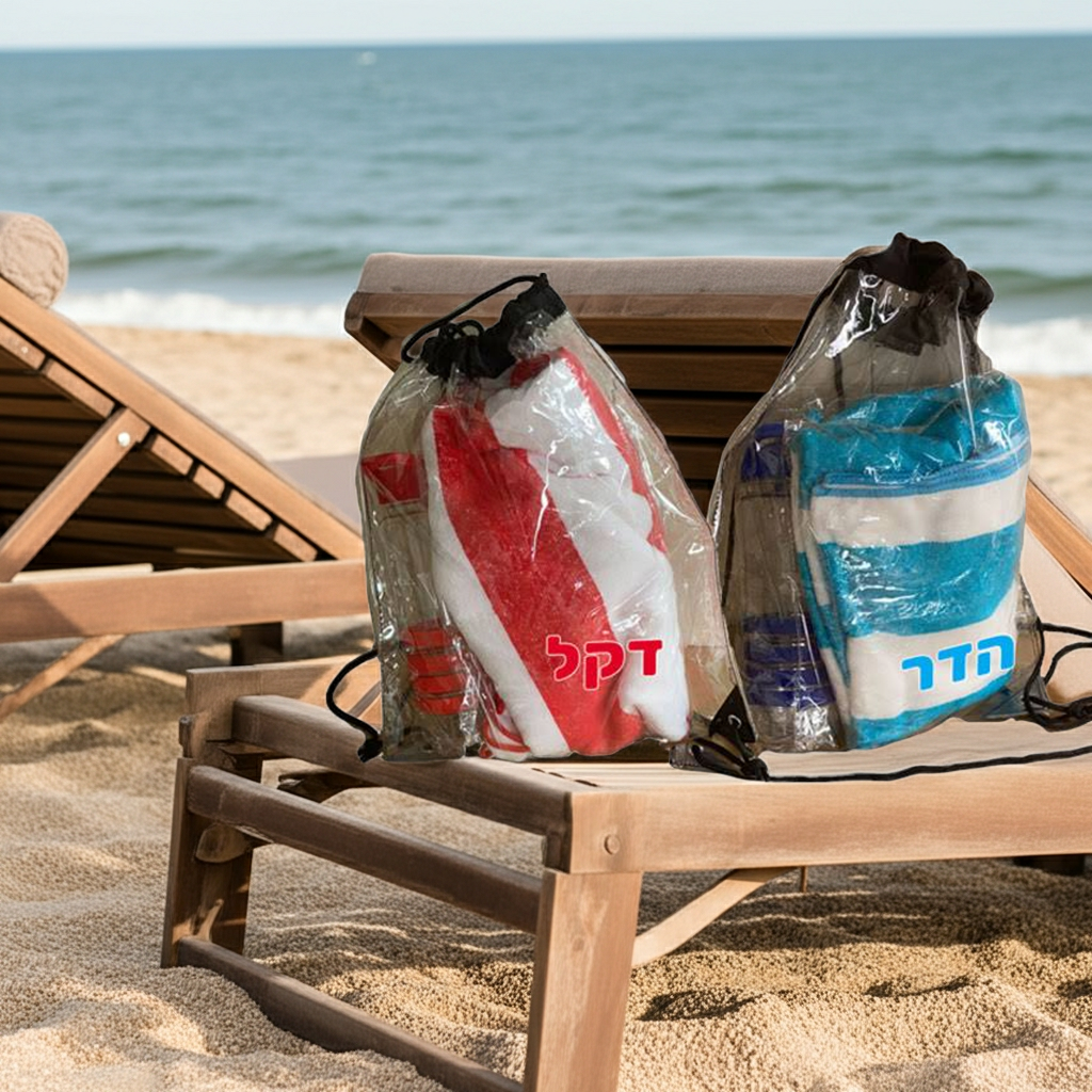 תיק שרוך שקוף עם שם הילד/ה בויניל איכותי, עשוי PVC בגודל כ-36*44 ס"מ – מתנה נהדרת לסוף שנה, מתאים לים / לבריכה / לקייטנה ועוד. תוסיפו מגבת ו/או בקבוק מים רב שימושי ויש לכם מתנה מושלמת. מתאים לילדי הגן הבוגרים, לתלמידים ולבוגרים. חיתוך אותיות ויניל בהדבקה.